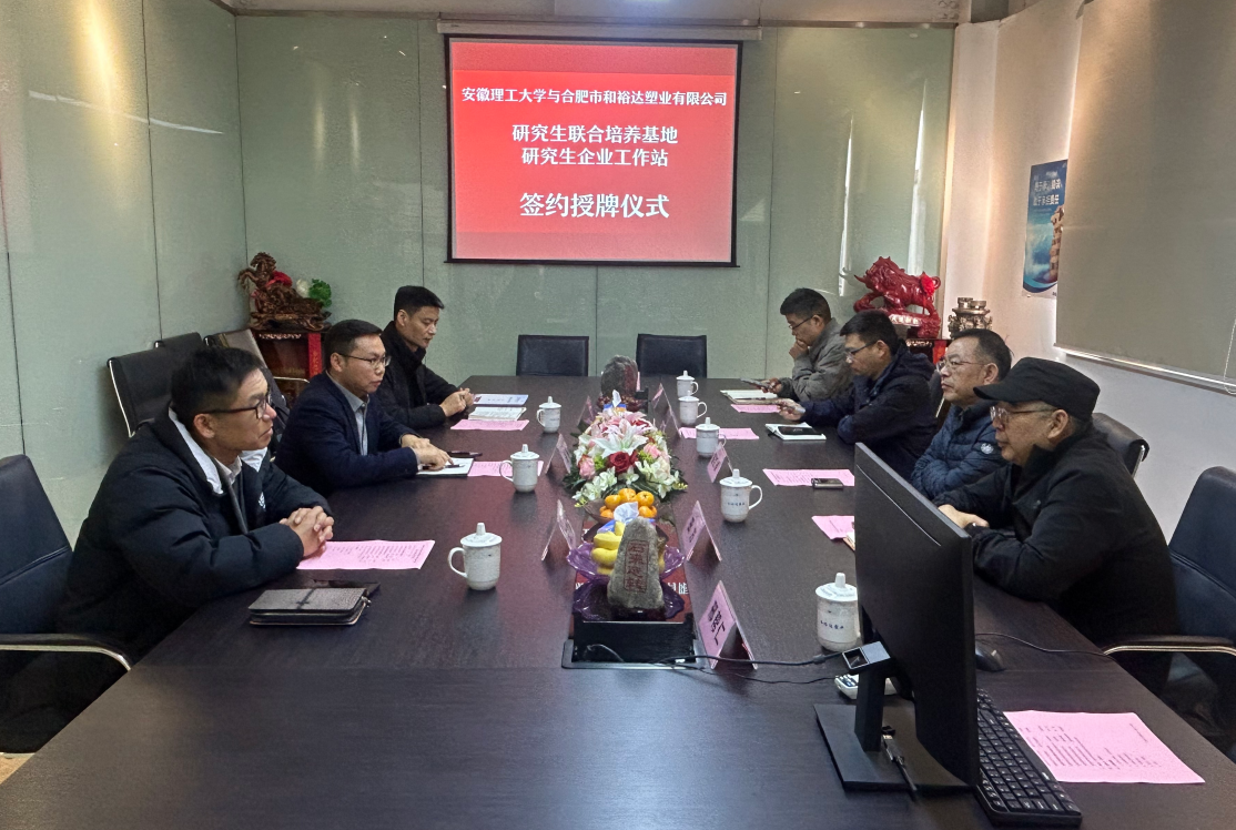 2025年11月20日上午,合肥市和裕達塑業有限公司與安徽理工大學研究生聯合培養基地、研究生企業工作站簽約暨揭牌儀式在和裕達隆重舉行。安徽理工大學材...